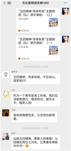 近日,醫(yī)院團委組織青年團員開展網(wǎng)上主題微團課學習,將共青團安慶市委員會主辦的“五四精神傳承有我”系列微團課,轉發(fā)至醫(yī)院團員微信群認真學習并展開討論。