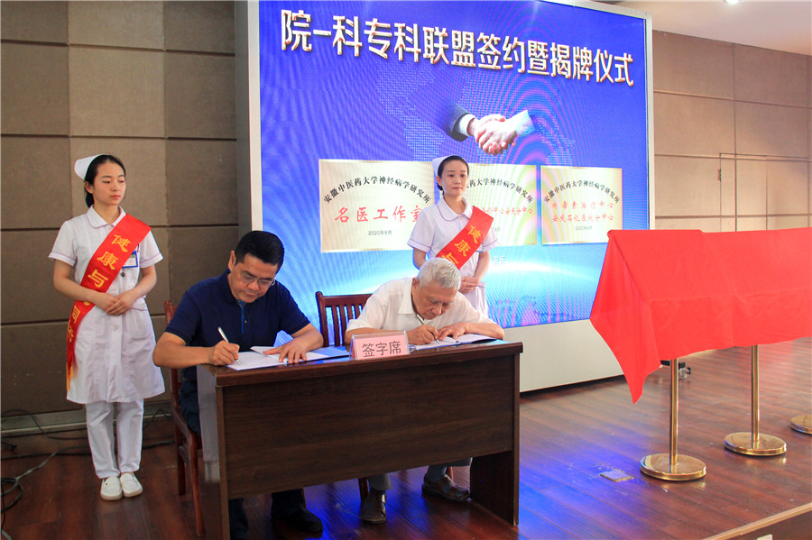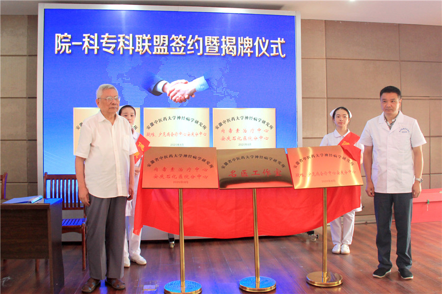 9月4日,南京鼓樓醫(yī)院集團安慶市石化醫(yī)院神經(jīng)內(nèi)科與安徽中醫(yī)藥大學(xué)神經(jīng)病學(xué)研究所附屬醫(yī)院舉行院-科專科合作簽約儀式,在南京鼓樓醫(yī)院集團安慶市石化醫(yī)院設(shè)立的“安徽中醫(yī)藥大學(xué)神經(jīng)病學(xué)研究所名醫(yī)工作室”、“安徽中醫(yī)藥大學(xué)神經(jīng)病學(xué)研究所疑難、少見病會診中心安慶分中心”和“安徽中醫(yī)藥大學(xué)神經(jīng)病學(xué)研究所肉毒素治療中心安慶石化醫(yī)院分中心”同步揭牌。