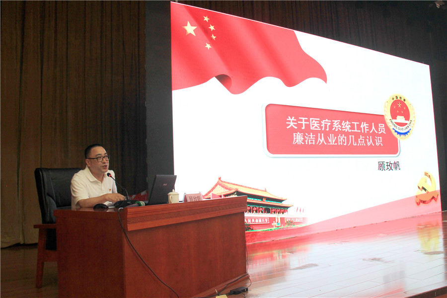 活動特邀安慶市檢察院黨組書記、檢察長顧玫帆,分享了自己對于醫(yī)療系統(tǒng)工作人員廉潔從業(yè)的思考與認識。顧檢察長結(jié)合反腐敗斗爭的新形勢、新要求,以及自己查辦的貪污腐敗案例,從執(zhí)法辦案和懲治犯罪的專業(yè)視角,對如何有效預防和打擊醫(yī)療行業(yè)犯罪進行詳細分析。以案說廉、由表及里的授課形式引人深思,激勵各位黨員干部以案為鑒,做到自省自律自警,不斷增強敬畏法紀的意識和拒腐防變的定力。