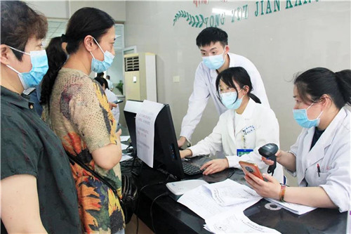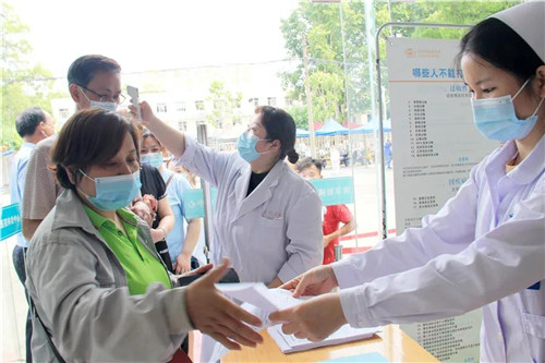 醫(yī)務(wù)人員為市民依次測量體溫,發(fā)放知情同意書并指導(dǎo)他們填寫相關(guān)信息。