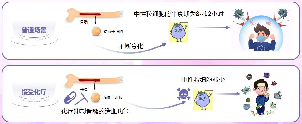 中性粒細(xì)胞具有吞噬和殺菌作用,是人體免疫系統(tǒng)的“衛(wèi)兵”。粒缺發(fā)生的原因是中性粒細(xì)胞的半衰期僅為8-12小時(shí), 因此骨髓必須不斷產(chǎn)生中性粒細(xì)胞。但在化療中,藥物會(huì)抑制骨髓的造血功能 ,使成熟的中性粒細(xì)胞凋亡后得不到及時(shí)更新,造成循環(huán)中的中性粒細(xì)胞數(shù)量減少 。