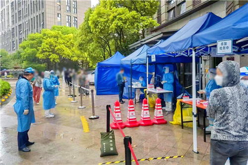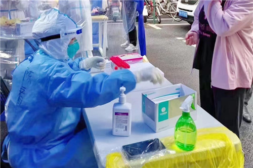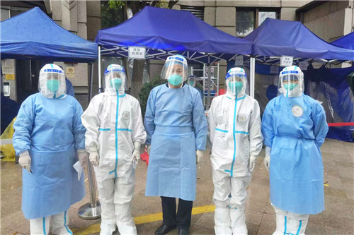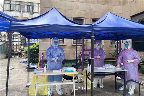 晚上10:00,援滬醫(yī)療隊從石化醫(yī)院乘坐大巴出發(fā)。路上,領(lǐng)隊疏平再次為所有隊員進(jìn)行防護(hù)知識培訓(xùn),并交代采集任務(wù)相關(guān)注意事項。次日凌晨5:45 抵達(dá)上海市靜安區(qū)。隊員們僅在車上簡單進(jìn)食、稍作休息,就立即投入核酸采集工作中。