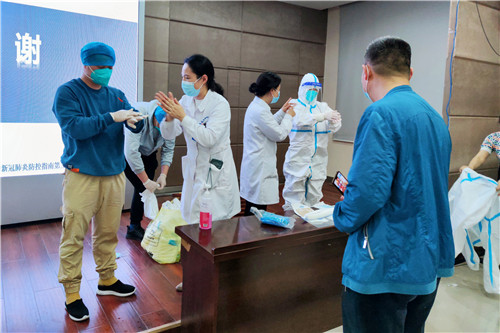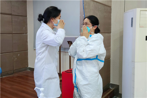 出發(fā)前,院感辦陳麗娟主任及程宏蘭老師為隊員們再一次強(qiáng)化培訓(xùn),講解注意事項,進(jìn)行一對一指導(dǎo),反復(fù)練習(xí)穿脫防護(hù)服及核酸采樣技術(shù)操作,確保人人過關(guān)。