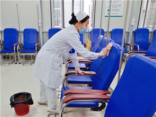 輸液室組長蔣海燕堅持每天提前到崗,仔仔細(xì)細(xì)地用消毒液擦凈每一張座椅,確?;颊呔歪t(yī)安全。
