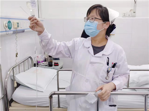 呼吸與危重癥醫(yī)學(xué)科余肖預(yù)產(chǎn)期將至,依然堅守崗位,為患者貼心服務(wù)。