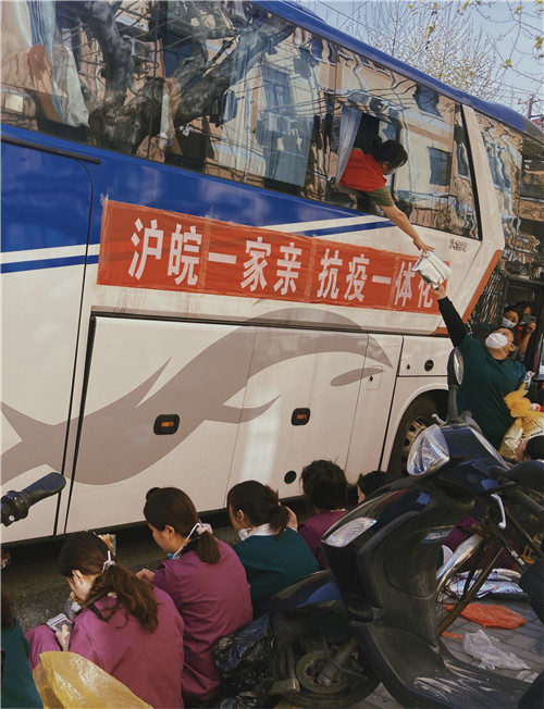 50名醫(yī)護(hù)緊急馳援上海,圓滿完成上級交派的任務(wù),連夜返回安慶,依規(guī)集中隔離。圖為結(jié)束一天的任務(wù)后,大家在集合的大巴處用餐。