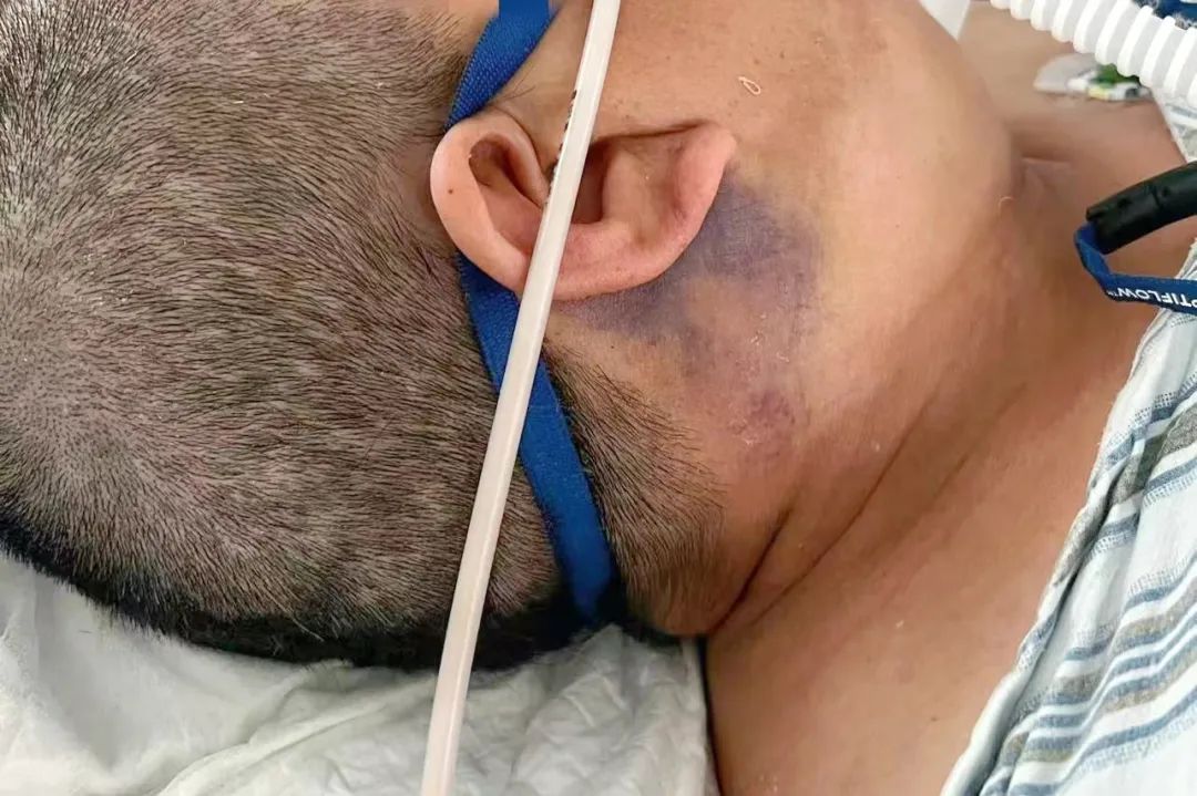 圖中患者已脫離呼吸機(jī),正使用經(jīng)鼻高流量氧療中,可見(jiàn)耳后大片皮下瘀血