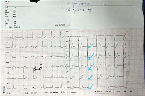 心電圖示aVR ST段抬高,胸導ST段壓低,提示心肌缺血