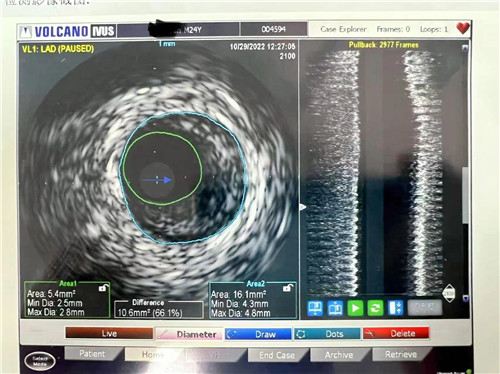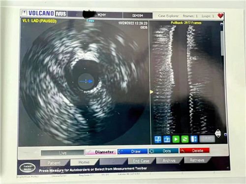 心血管內(nèi)科潘林艷醫(yī)生對其進行正規(guī)冠心病二級預防治療后,患者癥狀稍有緩解。副院長、科室主任汪念東及副主任徐先進再對其行冠脈造影(CAG)+血管內(nèi)超聲(IVUS)檢查,提示斑塊負荷重,確診為“急性冠脈綜合征”。