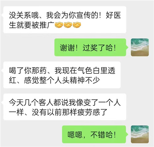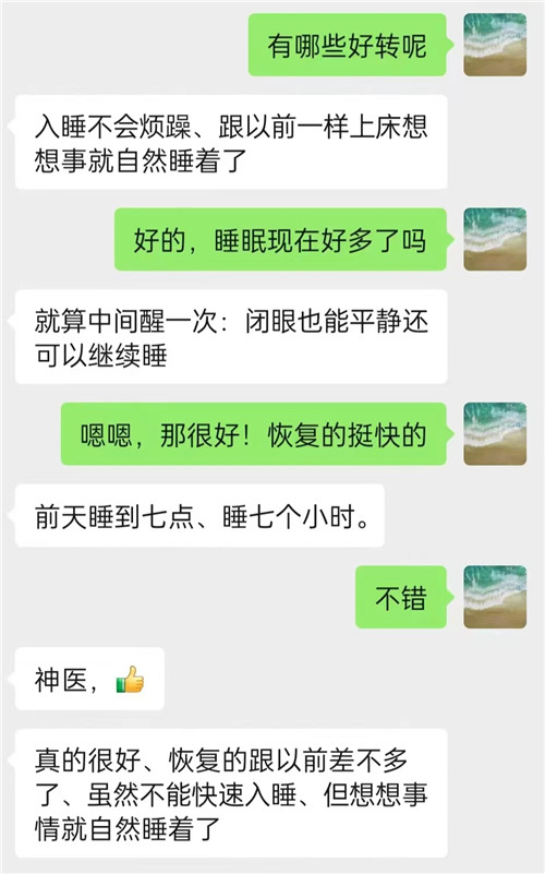 吃藥一周后,患者病情明顯好轉,每天能睡六七個小時,兩周后患者失眠癥狀消失。在微信中,他表達了對李醫(yī)生的感謝。