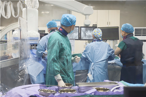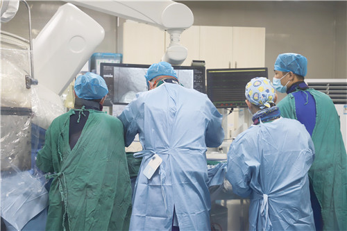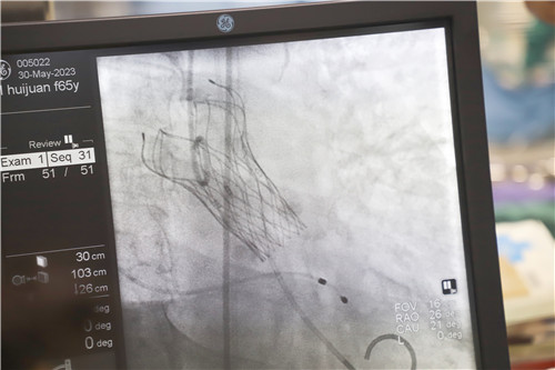 為保證創(chuàng)傷小、恢復快、并發(fā)癥可控,心血管內科聯合麻醉科、醫(yī)學影像科、超聲醫(yī)學科等多學科會診,反復溝通討論,最終決定施行TAVR手術,并征得王女士及家人的同意。該項微創(chuàng)介入技術對術者的技能操作水平和醫(yī)院的綜合救治能力要求極高,從大腿股動脈置入導管,再通過導管將人工生物心臟瓣膜輸送至已經病變狹窄的瓣膜位置,取代其瓣膜功能。