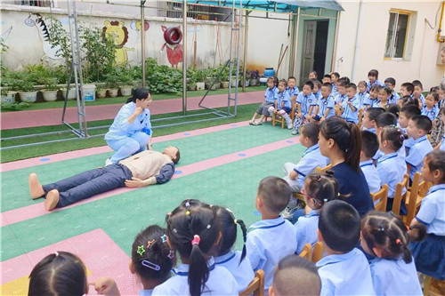 急診科主管護師方婷婷以“珍愛生命 遠離溺水”為題,詳細講述了游泳的注意事項,指導(dǎo)小朋友如何正確自救和施救。急診科護士長石嘉麗還向大家演示心肺復(fù)蘇操作流程和海姆立克急救法,進行急救知識培訓(xùn)。事業(yè)發(fā)展部副主任胡蝶講解心肺復(fù)蘇操作要點,手把手指導(dǎo)教學(xué)。部分師生上臺參與實操體驗,對急救知識有了更進一步的了解。