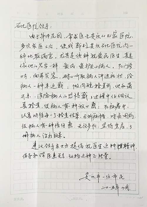 11月12日,我院周長江院長收到一封未署名市民來信。信中,該市民對我院消化內(nèi)科的醫(yī)療技術(shù)水平和醫(yī)療服務(wù)質(zhì)量給予高度肯定,并特別表揚了該科的祝愛民醫(yī)生。