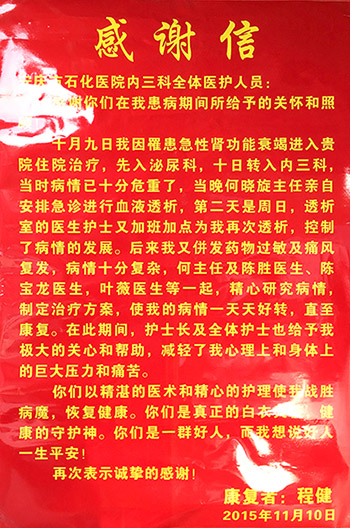 近日,患者向我院腎內(nèi)-老年-風(fēng)濕病科送上一封感謝信,贊揚科室醫(yī)護人員的精湛醫(yī)術(shù)和精心護理,感謝他們的關(guān)懷和幫助。