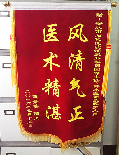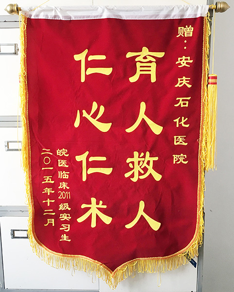 近日,我院獲錦旗多面,泌尿外科周國保主任、操志宏、韓兵醫(yī)生及全體醫(yī)護(hù),內(nèi)分泌科王安主任及全體醫(yī)護(hù)的醫(yī)術(shù)、醫(yī)德均受患者好評稱贊,同時,我院還受到皖醫(yī)臨床2011級實習(xí)生的錦旗贊揚。