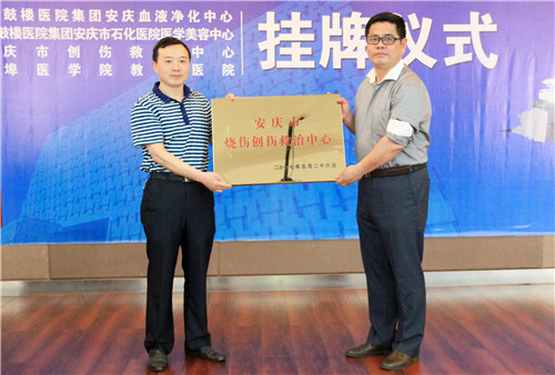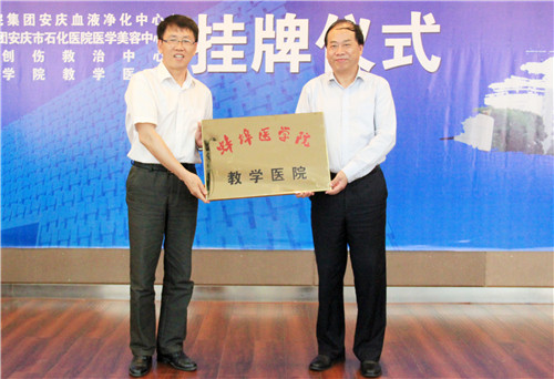 5月26日上午,我院在多功能廳舉辦院慶2周年暨“蚌埠醫(yī)學院教學醫(yī)院”、“安慶市燒傷創(chuàng)傷救治中心”、“南京鼓樓醫(yī)院集團血液凈化中心”、“南京鼓樓醫(yī)院集團安慶市石化醫(yī)院醫(yī)學美容中心”系列掛牌儀式。蚌埠醫(yī)學院、南京鼓樓醫(yī)院、安慶市衛(wèi)計委、金陵藥業(yè)部分領(lǐng)導蒞臨指導,院領(lǐng)導班子全體成員、全院班組長以上干部參加。