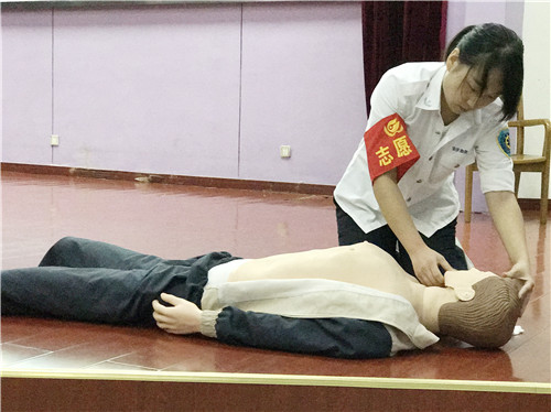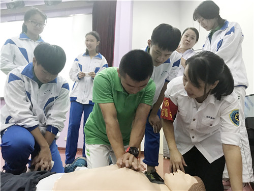 培訓(xùn)在石化一中的階梯教室舉行,現(xiàn)場擺放了由紅十字會統(tǒng)一制作發(fā)放的宣傳展板和橫幅。培訓(xùn)開始,首先,觀看了由紅十字會提供的急救視頻,讓大家對心肺復(fù)蘇有了初步了解。隨后,由危急重癥專業(yè)組的成員向同學(xué)們示教,詳細(xì)講解心肺復(fù)蘇的具體操作步驟、方法和注意事項。最后,同學(xué)們積極要求參與實踐,老師們手把手指導(dǎo)學(xué)生們觀察呼吸、心跳,并讓大家在模型上切身體會了一下心肺復(fù)蘇的正確操作技術(shù)。