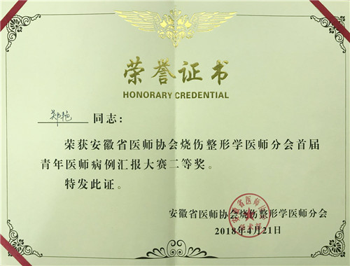 4月21日,在安徽省醫(yī)師協(xié)會(huì)燒傷整形學(xué)醫(yī)師分會(huì)首屆青年醫(yī)師病例匯報(bào)大賽上,我院燒傷整形二病區(qū)楊賢金主任率領(lǐng)年輕醫(yī)生鄭艷、王超參賽。